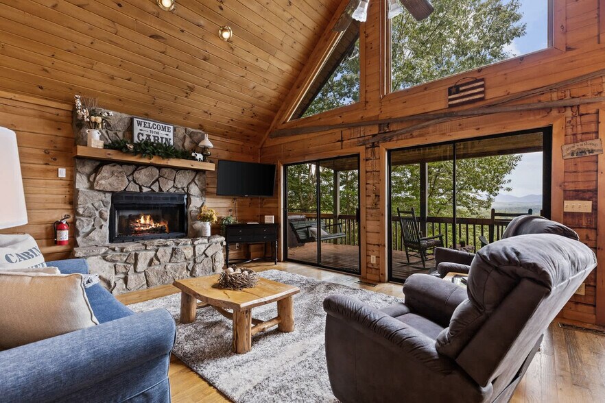 This 3-bedroom cabin in the scenic My Mountain Community is just 10 minutes from downtown Blue Ridge, offering everything for an amazing vacation. Nestled at the quiet end of a quaint mountain road, this cabin provides both privacy and proximity to the charming downtown area. Inside, you'll find a warm, welcoming interior with a freshly remodeled loft bedroom and bathroom. The spacious deck offers a front-row seat to jaw-dropping mountain views, ideal for morning coffee or evening wine. Welcome to your peaceful mountain escape in the heart of Blue Ridge country. This cabin comfortably accommodates up to 6 guests with its 3 bedrooms and 2 bathrooms. The main level features a king-size bed, while the upper level offers another king-size bed with an ensuite bathroom and a queen-size bed. The chef’s kitchen is fully stocked with high-end stainless appliances, a large refrigerator, and ample cabinetry. The living room boasts a 65” smart TV, plush seating, an indoor fireplace, and direct deck access. Enjoy the game room with a foosball table and darts, or relax in the brand-new hot tub under the stars. Up to 2 dogs are allowed for $125 per stay, and we kindly ask that your dog is crate trained and that you pick up after your dog. Parking is available for 3 cars in the driveway. Located in the sought-after My Mountain Community of Morganton, GA, this cabin is just a short 10-minute drive from the shops, dining, and charm of downtown Blue Ridge. Nearby attractions include Brasstown Bald, Track Rock Gap Archaeological Site, Lake Nottely, and Chattahoochee National Forest. Enjoy local dining at Smith House, Dancing Bear Appalachian Bistro, and Chestnut Grill. Renting a car is a convenient option to explore the area at your own pace. Check-in is at 4pm and check-out is at 10am. No parties are allowed, and violations may result in immediate termination of the stay. An exterior camera is installed solely to monitor our cleaning team for quality and security purposes. Guests must be 21 years or older to book this property. A guest verification process is required within 48 hours of booking confirmation, and a rental agreement must be signed prior to check-in. A non-refundable $60 damage waiver is required, covering accidental damage during your stay, provided it is reported prior to check-out. [SI]