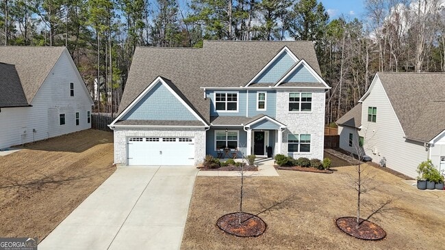 WILLIS RD Elementary, ***LEE Middle*** & EAST COWETA High School district!! Enter through the foyer with hardwood flooring that continues into the dining room and kitchen/breakfast area. The kitchen includes stainless steel appliances including BUILT-IN OVEN/MICROWAVE, GAS COOKTOP. Tile flooring is in all bathrooms and the laundry room. The PRIMARY SUITE is located on the MAIN LEVEL and includes a bathroom with a walk-in tile shower with glass door and a separate garden tub with tile surround. A main-level office with a closet can be used as a 5th bedroom. Upstairs are additional bedrooms, including one with a private EN-SUITE Bathroom. The backyard is wooded and includes a SCREENED-IN PORCH with an OUTDOOR FIREPLACE. Community amenities include a pool, tennis and pickleball courts, playground, and dog park. The property is less than 10 minutes from Costco, Sam's, shopping centers, and schools.