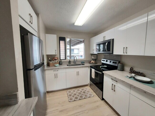 Don't miss this UNFURNISHED 3rd floor (stairwell access only) charming 2-bedroom, 1-bathroom residence recently remodeled with new white kitchen, stainless steel appliances, and larger sized washer/dryer in the living room. Unit comes with 2 parking spaces right in front of the unit, community pool, BBQ area and guest parking. Sweeping views of Pearl Harbor and stunning sunsets right from the private lanai, Pearlridge Mall and surrounding shops and restaurants nearby. Ceiling fans and window AC unit ensure year-round comfort. Tenant pays electricity, cable/internet in addition to rent. 1 year lease to start, sorry no smoking of any kind in the unit and no pets. Renter's insurance required. Available now for immediate move in.