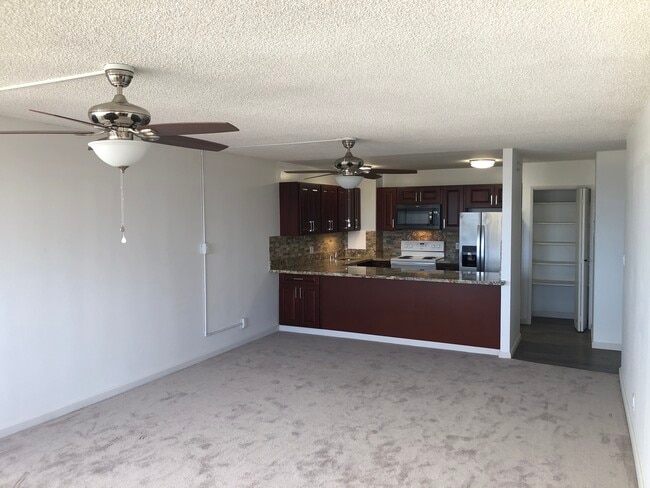 This beautiful apartment was originally a 3 bedroom but was converted into a 2 bedroom apartment. Both bedrooms are spacious and ideal for a family, for students who wish to share or for someone who works from home. This is a corner apartment which is very spacious, well lit and close to the elevators. The living room faces the ocean for some incredible sunsets and the balcony faces downtown Honolulu. The apartment was recently renovated, and the renovations include updated kitchen and electrical, ceiling fans in living room and bedrooms, new carpet in the living room, drapes and blinds and flooring in kitchen and hallway. Window air conditioners are in the living room and bedrooms. Other conveniences include a laundry room within the apartment, storage closets and a large walk-in closet attached to the master bedroom. There is a large garden deck with a huge swimming pool and a pavilion for entertainment. The deck is beautifully landscaped with fountains and waterfalls. 24 hour security, access control, basic cable, water and sewer, and hot water are included in rent. The building is in walking distance to downtown and Chinatown, Aloha Tower and Foster Gardens. Safeway supermarket and Longs Drugs store behind the building. Must see the size of apartment and amazing views!