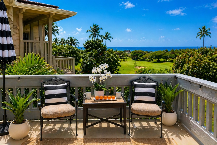 Wake up to ocean views from the primary suite and enjoy morning coffee or sunset evenings from expansive upper and lower lanais overlooking lush green space and the Pacific beyond.