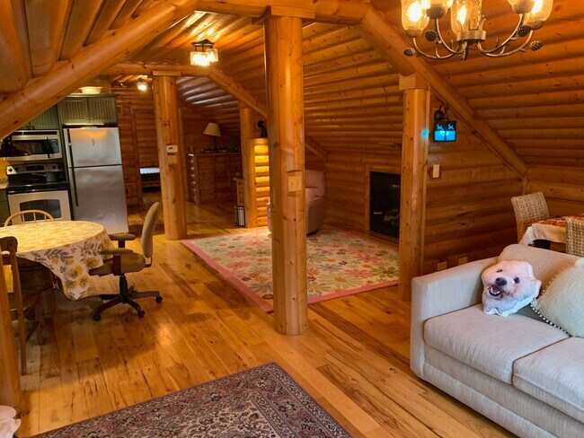 This Barrington Hills Log Cabin Apartment is a stand alone building. Quiet setting on a private lake with modest walk to town. A real Gem. Hickory hard wood floors throughout 9 Windows offer natural light 2 Built in large flat screen TV's Beautiful new deck with outstanding views Cozy gas fireplace with EZ turn on switch Brand new large washer and dryer Walk in Closet May be furnished or not as preferred