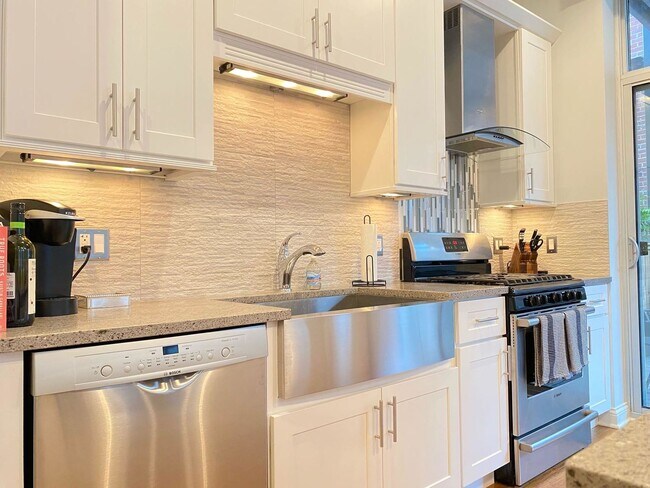 Short term or long term lease available starting 9/1/20 through 4/5/21, 7/31/21 or 8/31/21. There are only 3 of these amazing 1 bedroom/1.5 baths in the building. This unique corner unit offers an open concept living/dining space (larger than other units), separate kitchen pantry, hallway nook for desk/workspace and a HUGE outdoor terrace. Madison Throop Place is one of the West Loop's boutique rental properties. Located at 1247 and 1249 W. Madison St, these stunning apartments offer true condo-quality finishes. Units at Madison Throop Place feature: gourmet chef's kitchen complete with stainless steel Bosch appliances, quartz countertops and island, mixed glass backsplash, glass range hood and solid wood cabinetry. The efficiently designed living areas and bedroom have bamboo hardwood floors throughout the entire unit, custom designer paint, crown molding and up to ten-foot ceilings. Each bedroom has a custom designed closet with ample shelving and storage. The bathrooms are finished with Italian marble, huge glass showers, and solid wood cabinetry. All units include a washer/dryer in-unit, individually controlled heating and cooling, and a balcony or private outdoor space. Madison Throop Place's convenient West Loop location provides easy access to The Loop, Fulton Market District and the Eisenhower and Kennedy Expressways. The building is walking distance from 1K Fulton, Target, Skinner Park, and the city's best dining on Restaurant Row. One heated garage parking spot available for $150/month