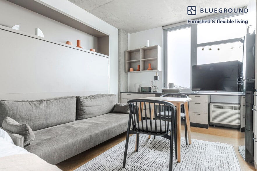 Show up and start living from day one in Chicago with this cozy studio Blueground apartment. You’ll love coming home to this thoughtfully furnished, beautifully designed, and fully equipped Goose Island home. (ID #CHI1283) The advertised rate of $1,530/month is the lowest available price, based on a 1 month(s) and 22 day(s) stay with a move-in date of February 23, 2026. If you’re looking for a 1-year stay, the rate is $1,750/month. Rates vary depending on the duration of stay, season, and other parameters. For exact pricing and additional pricing components, please visit our website and enter your desired move-in and move-out dates. The rate is applicable when billed upfront; it can be higher if billed in multiple payments. Brokers are welcome to reach out. Were you looking for an unfurnished lease? Try Blueground instead and upgrade from unfurnished to furnished living: - Furnished at rates comparable to unfurnished - No setup or furniture costs - save thousands - Move-in ready - save time, just bring your suitcase Designed with you in mind Thoughtfully designed with bespoke finishes, modern furnishings, and a fully equipped kitchen, you’ll enjoy that “I’m home” feeling with this Blueground apartment. Whether you’re lounging in your lovely living room streaming the latest and greatest entertainment on the smart TV or premium wireless speaker, or getting some well-earned rest on the superior quality mattress with luxury linens, you’ll fall in love with everything this Goose Island apartment has to offer. This apartment also offers in-apartment laundry. Sleeping arrangements King Bed, 70.8in/180cm Amenities Building amenities unique to this studio apartment include an on-site: - Dryer - Elevator - Washing machine - Lounge Arrival and ongoing support The entire apartment is yours to enjoy! Throughout your stay, you’ll have access to our Client Experience team through the Blueground App. You can schedule additional cleanings, submit maintenance requests, and view our neighborhood recommendations with just a few taps. We’ll share all details upon confirmation of your stay. Other things to note Building amenities may have an extra cost. This Blueground apartment has flexible lease options, allowing you to book it for one month, a year, or more. We take great pride in ensuring every photo displayed is shot in our own units with our actual furnishings. That said, we regularly refresh our decor and furniture arrangement, which may differ from what’s pictured. [SI]