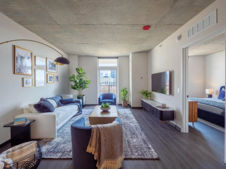 Spacious and sophisticated 1 bedroom, 1 bathroom residence spanning 826 sq.ft with an open, light-filled layout designed for modern city living. Floor-to-ceiling windows flood the space with natural light, while the chef-inspired kitchen boasts premium appliances, abundant cabinet space, and sleek countertops — perfect for both everyday meals and entertaining. The generous bedroom offers excellent closet storage, and the elegant bathroom features contemporary finishes. In-unit laundry and thoughtful design details elevate everyday convenience.