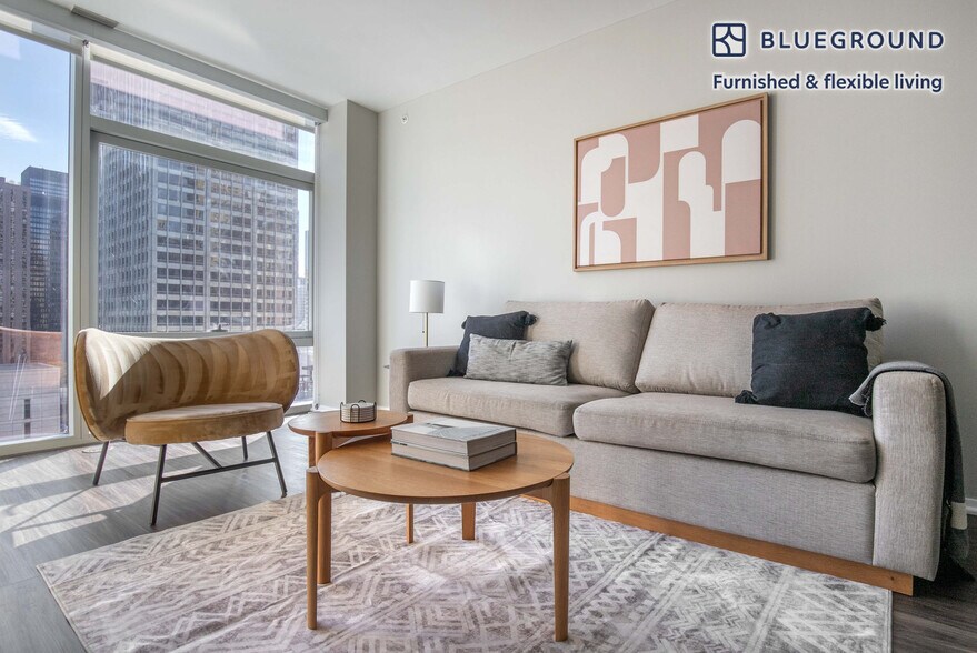 Discover the best of Chicago, with this one bedroom apartment in Streeterville with views over the city. It’ll be easy to simply show up and start living in this furnished apartment with its fully equipped kitchen, living room, and our dedicated, on-the-ground support. (ID #CHI996) The advertised rate of $3,190/month is the lowest available price, based on a 12 month(s) stay with a move-in date of July 11, 2026. Rates vary depending on the duration of stay, season, and other parameters. For exact pricing and additional pricing components, please visit our website and enter your desired move-in and move-out dates. The rate is applicable when billed upfront; it can be higher if billed in multiple payments. Brokers are welcome to reach out. Were you looking for an unfurnished lease? Try Blueground instead and upgrade from unfurnished to furnished living: - Furnished at rates comparable to unfurnished - No setup or furniture costs - save thousands - Move-in ready - save time, just bring your suitcase Designed with you in mind Gorgeous furniture, fully equipped kitchen, smart TV, and a premium wireless speaker are just a few of the amenities you’ll find inside this one bedroom apartment. Ideally located in Chicago, you’ll find a lot to love outside as well. When you’re ready to relax, you’ll be happy to discover every Blueground bedroom comes with superior quality mattresses, fully stocked linens, and cozy towels. We handle everything so you can simply show up and start living. This apartment also offers in-apartment laundry. Sleeping arrangements King Bed, 70.8in/180cm Amenities Building amenities unique to this one bedroom apartment include an on-site: - Doorman - Dryer - Elevator - Swimming pool - Washing machine - Lounge - Pets allowed - Sauna Arrival and ongoing support The entire apartment is yours to enjoy! Throughout your stay, you’ll have access to our Client Experience team through the Blueground App. You can schedule additional cleanings, submit maintenance requests, and view our neighborhood recommendations with just a few taps. We’ll share all details upon confirmation of your stay. Ideally Located This furnished rental is located in Streeterville, only a 5 minute walk from The Loop. One of the fastest-developing neighborhoods in Chicago, Streeterville extends out into Lake Michigan and attracts a blend of young professionals, students, and tourists. A plethora of amenities and activities exist for every lifestyle. From Navy Pier activities to luxury shopping on Michigan Avenue, it is a walkable community with easy access to entertainment. Other things to note Building amenities may have an extra cost. This Blueground apartment has flexible lease options, allowing you to book it for one month, a year, or more. Pets are welcome, though weight limits and breed restrictions apply and may incur fees. We take great pride in ensuring every photo displayed is shot in our own units with our actual furnishings. That said, we regularly refresh our decor and furniture arrangement, which may differ from what’s pictured. Also note - This apartment's central location means it can be noisy at times - This is a guarded building equipped with a doorman/concierge at all times [SI]