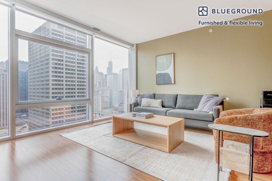 Feel at home wherever you choose to live with Blueground. You’ll love this beautiful Streeterville furnished one bedroom apartment with its modern decor, fully equipped kitchen, and roomy living room with great high floor views. Ideally located, you’re close to all the best that Chicago has to offer! (ID #CHI876) The advertised rate of $3,250/month is the lowest available price, based on a 12 month(s) stay with a move-in date of March 3, 2026. Rates vary depending on the duration of stay, season, and other parameters. For exact pricing and additional pricing components, please visit our website and enter your desired move-in and move-out dates. The rate is applicable when billed upfront; it can be higher if billed in multiple payments. Brokers are welcome to reach out. Were you looking for an unfurnished lease? Try Blueground instead and upgrade from unfurnished to furnished living: - Furnished at rates comparable to unfurnished - No setup or furniture costs - save thousands - Move-in ready - save time, just bring your suitcase Designed with you in mind Gorgeous furniture, fully equipped kitchen, smart TV, and a premium wireless speaker are just a few of the amenities you’ll find inside this one bedroom apartment. Ideally located in Chicago, you’ll find a lot to love outside as well. When you’re ready to relax, you’ll be happy to discover every Blueground bedroom comes with superior quality mattresses, luxury linens, and cozy towels. We handle everything so you can simply show up and start living. This apartment also offers in-apartment laundry. Sleeping arrangements King Bed, 70.8in/180cm Amenities Building amenities unique to this one bedroom apartment include an on-site: - Doorman - Dryer - Elevator - Swimming pool - Washing machine - Lounge - Pets allowed - Sauna Arrival and ongoing support The entire apartment is yours to enjoy! Throughout your stay, you’ll have access to our Client Experience team through the Blueground App. You can schedule additional cleanings, submit maintenance requests, and view our neighborhood recommendations with just a few taps. We’ll share all details upon confirmation of your stay. Ideally Located This furnished rental is located in Streeterville, only a 5 minute walk from The Loop. One of the fastest-developing neighborhoods in Chicago, Streeterville extends out into Lake Michigan and attracts a blend of young professionals, students, and tourists. A plethora of amenities and activities exist for every lifestyle. From Navy Pier activities to luxury shopping on Michigan Avenue, it is a walkable community with easy access to entertainment. Other things to note Building amenities may have an extra cost. This Blueground apartment has flexible lease options, allowing you to book it for one month, a year, or more. Pets are welcome, though weight limits and breed restrictions apply and may incur fees. We take great pride in ensuring every photo displayed is shot in our own units with our actual furnishings. That said, we regularly refresh our decor and furniture arrangement, which may differ from what’s pictured. Also note - This is a guarded building equipped with a doorman/concierge at all times - On-street parking near the building is not allowed [SI]