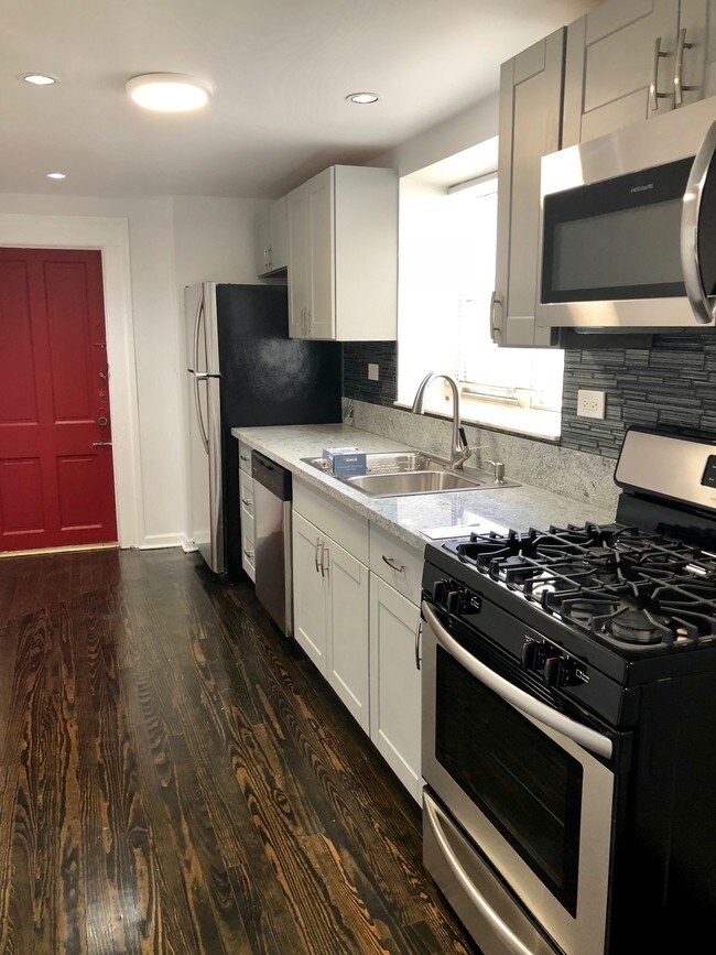 Beautiful, bright, l bedroom new rehab of first floor (three steps below grade) one bed, one bath unit with private address and entrance! Heated foyer big enough to be used as small office/bonus room . Secondary door closes it off to the unit. Full size glass block windows allow tons of natural light to shine in. Gleaming, refinished hard wood floors throughout, new beautiful kitchen with stainless, granite and glass tile backsplash. Stunning bathroom is a perfect combo of vintage charm and modern features. 2 blocks from Metra, 4 blocks from the L. Heat included. Located in a quiet 3 unit building on a tree lined street. A charming place to call home!