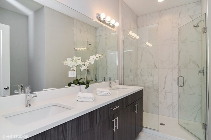 The spacious living area, recessed lighting, and tons of natural light from the large windows. The kitchen features brand new stainless steel appliances, plenty of cabinet space, a large eat-in breakfast bar, and chic pendant lights. The master bedroom has a walk-in-closet and ensuite bath with dual sink vanity and glass enclosed shower. Good sized second bedroom with ample closet space. Contemporary second bath. In-unit washer and dryer. Exterior parking spaces. Excellent Tri-Taylor location near Rush, UIC, and Little Italy with convenient access to public transportation and expressways.