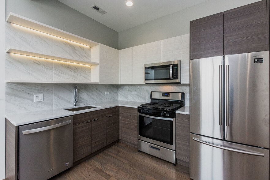 Fully Renovated, High-End 1 Bed / 1 Bath | Ukrainian Village | 650 ft² Experience modern living in this beautifully renovated 1-bedroom, 1-bathroom rear unit located in the heart of Ukrainian Village in Chicago. Meticulously updated in 2020 with premium finishes, this 650-square-foot home is part of an intimate 6-unit building and offers an abundance of natural light, stunning hardwood floors throughout, and a spacious open-concept layout. The living area flows effortlessly into a contemporary kitchen featuring sleek cabinetry, quartz countertops, a tiled backsplash, under-cabinet lighting, and stainless steel appliances—including a built-in microwave, dishwasher, and garbage disposal. The oversized, king-sized bedroom (15' x 13') includes custom closets and a private en suite bathroom, outfitted with stylish tile flooring, a floating vanity, an LED-lit mirror, and high-end fixtures. Additional upgrades include a smart digital thermostat for year-round comfort, water detectors for added peace of mind, and elegant, energy-efficient recessed LED lighting throughout. Central heating and cooling, along with an in-unit washer and dryer, provide convenience and comfort. A rear deck offers a peaceful outdoor space for relaxing. **Photos may represent a similar unit in the building**