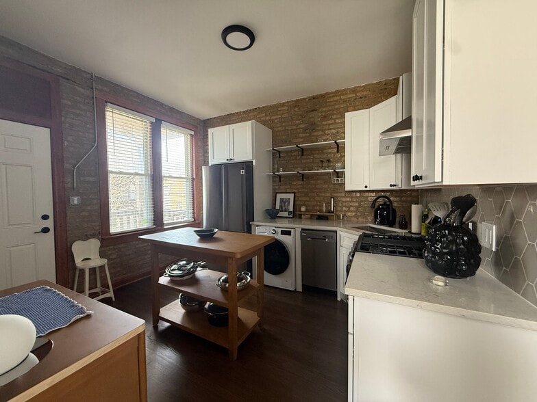 Live in this beautifully updated 2 bed, 1 bath apartment in the heart of Humboldt Park! This unit features a brand new kitchen with quartz countertops, stainless steel appliances, and an exposed brick accent wall, along with a newly renovated bathroom. Enjoy the convenience of a new in-unit washer and dryer, refinished hardwood floors throughout, and private outdoor space. (Note: kitchen photos are renderings.) The living room measures 11'2" x 13'1", bedroom one is 7'4" x 10', and bedroom two is 7'2" x 11'2". Conveniently located near Humboldt Park and popular neighborhood spots like Rootstock Wine & Beer Bar, Segnatore Italian, Spinning J Bakery & Soda Fountain, Lucy’s Fried Chicken & Smashburgers, Gaoku Izakaya & Craft Drinks, Humboldt Park Health, and First Ascent Humboldt Park climbing gym. $350 admin fee applies.