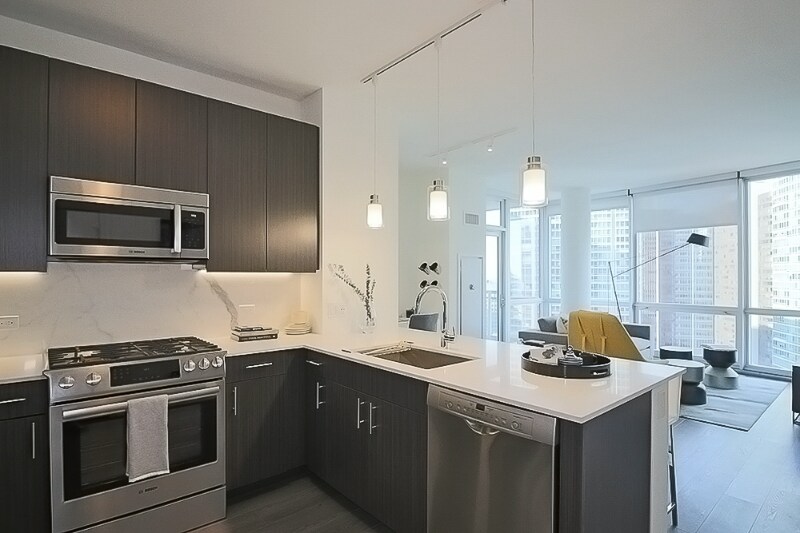 This sleek Streeterville high rise is packed with luxury and convenience. Kick back on the expansive sun deck with pool, cabanas and outdoor lounge fireplace, grilling and dining area, offset with amazing lake and city views. An indoor residents lounge with demonstration kitchen and billiards room gives you space to work or entertain. Staying fit is a breeze with a fitness center, spin and yoga studio. Each unit greets you with wood plank flooring, maple white quartz, stainless steel appliances and floor-to-ceiling windows.