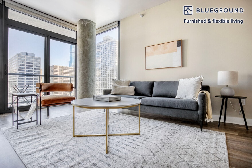 Feel at home wherever you choose to live with Blueground. You’ll love this charming Near North Side furnished one bedroom apartment with its modern decor, fully equipped kitchen, and pretty living room with great balcony views. Ideally located, you’re close to all the best that Chicago has to offer! (ID #CHI1008) The advertised rate of $3,506/month is the lowest available price, based on a 1 month(s) and 24 day(s) stay with a move-in date of March 1, 2026. If you’re looking for a 1-year stay, the rate is $3,832/month. Rates vary depending on the duration of stay, season, and other parameters. For exact pricing and additional pricing components, please visit our website and enter your desired move-in and move-out dates. The rate is applicable when billed upfront; it can be higher if billed in multiple payments. Brokers are welcome to reach out. Were you looking for an unfurnished lease? Try Blueground instead and upgrade from unfurnished to furnished living: - Furnished at rates comparable to unfurnished - No setup or furniture costs - save thousands - Move-in ready - save time, just bring your suitcase Designed with you in mind As with any Blueground apartment, you’ll find a thoughtfully designed space complete with beautiful furniture and a fully equipped kitchen in this one bedroom property. And, thanks to our superior quality mattresses, fully stocked linens, and towels, you can relax knowing you’ll always feel comfortably at home. When you’re ready for some fun, you can take in the Chicago vibes or bring the entertainment to you with the premium wireless speaker or smart TV. This apartment also offers in-apartment laundry. Sleeping arrangements Queen Bed, 63in/160cm Amenities Building amenities unique to this one bedroom apartment include an on-site: - Doorman - Dryer - Elevator - Swimming pool - Washing machine - Parking - Pets allowed Arrival and ongoing support The entire apartment is yours to enjoy! Throughout your stay, you’ll have access to our Client Experience team through the Blueground App. You can schedule additional cleanings, submit maintenance requests, and view our neighborhood recommendations with just a few taps. We’ll share all details upon confirmation of your stay. Ideally Located This furnished apartment is located in Chicago's Near North Side neighborhood. Part of the storied Miracle Mile, this thriving neighborhood set on the shore of Lake Michigan is home to some of the city's most notable skyscrapers. The Near North Side has a fabulous dining scene, with everything from Chicago-style pizza to casual pubs to five-star restaurants. Neighborhood highlights include the Museum of Contemporary Art and 360 Chicago, a skyscraper with an observation deck. There's also Navy Pier, a lakefront park with casual dining, dinner cruises and carnival rides. The Near North Side is served by the CTA's Brown, Red and Purple Lines, as well as several bus routes. Other things to note Building amenities may have an extra cost. This Blueground apartment has flexible lease options, allowing you to book it for one month, a year, or more. Pets are welcome, though weight limits and breed restrictions apply and may incur fees. Parking is offered based on availability and is subject to a fee. We take great pride in ensuring every photo displayed is shot in our own units with our actual furnishings. That said, we regularly refresh our decor and furniture arrangement, which may differ from what’s pictured. [SI]