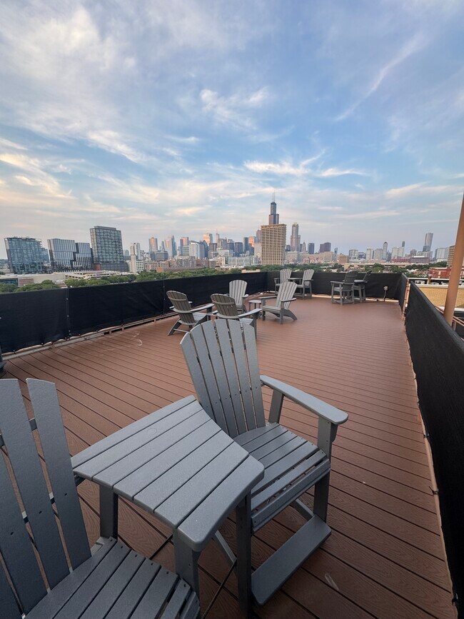 1 Bedroom/1 Bath loft apartment with 1 Secure Parking Space Included! Located in a safe and secure full amenity building. Cable TV (66 channels) and Internet INCLUDED in the rent. Very popular building with healthcare professionals. Walking distance to the Chicago Medical District. • Bright and sunny top floor corner loft with large windows, high ceilings and balcony with great views of the Chicago skyline. • Secured outdoor parking space with garage door opener. • Hardwood floors, except for carpet in the bedroom and tile in the bathroom. • High-end stainless steel appliances including gas stove/oven, French doors refrigerator, dishwasher and microwave. • Granite counter-top in the kitchen. • Recently replaced washer and dryer, in the unit. • Large windows with shades. • Oversize bedroom with a large closet with closet organizer. • Large storage cage. • Gas fireplace. • Balcony. • Secured building with a large lobby, door attendant and on-site building engineer. • Nicely equipped exercise, bicycle, and package holding rooms. • Trash chute on each floor. • Large roof top deck with 360 degrees view. Fantastic view of the Chicago downtown. • Walk to CTA, “L”, campus transportation, Medical & Dental schools and hospitals.