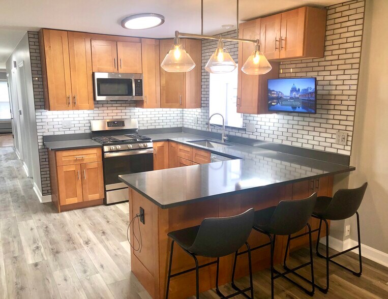 New cabinets, 42” uppers with under lit cabinets, all new S/S Appliances with outdoor vented hood.