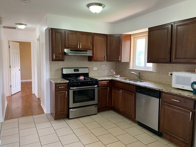 Great large 4 bedroom/1 bath with plenty of space and right next door to wide open green space and park where you can enjoy free Friday night concerts all summer long. Eat-in kitchen with plenty of cabinets, granite counters and stainless appliances. Hardwood floors. Designated washer and dryer and separate storage space included. Great big yard and spacious garage with extra parking on driveway. Super close to Rosemont's Fashion Outlet Mall, Theater and expressways. No smoking. Pets will be considered on case-by-case basis.