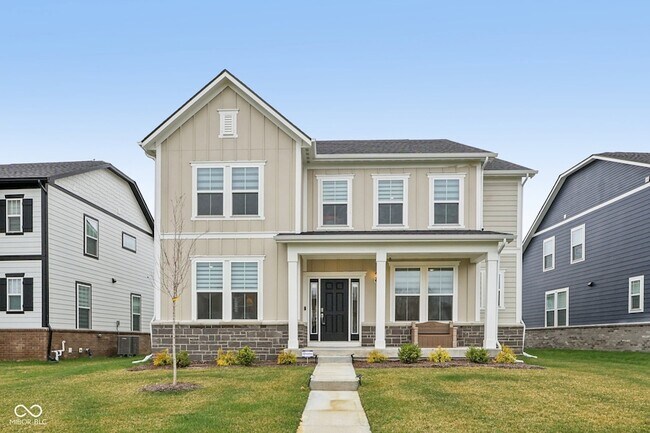 Move-in ready 5 bedroom home for sale in Carmel, Indiana located in the sought-after Ambleside community, featuring a finished basement, main level bedroom, and over $100,000 in upgrades. Built in 2024, this home offers 3 separate living areas ideal for modern living, entertaining, and multi-generational needs. The main level features an open-concept layout with a spacious living room, fireplace, and a designer kitchen with quartz countertops, 42-inch cabinetry and a full gas built-in appliance package including cooktop, chimney hood, and wall oven with microwave, plus a butler's pantry for added prep space and storage. The breakfast area and dining room provide flexibility for everyday living and hosting, while the main-level bedroom with full bath is perfect for guests, a private office, or in-law quarters. The covered patio extends your living space outdoors, creating an easy flow for relaxing or entertaining. Upstairs, a versatile loft offers a second living area and separation between the owner's suite and 3 additional bedrooms. The primary suite features a spacious layout, walk-in closet with custom shelving, dual vanities, and a spa-inspired bath with an oversized tiled walk-in shower, along with upgraded finishes including quartz and granite surfaces, rectangular sinks, comfort-height toilets, and wood-look tile details. The finished basement adds even more living space with a large recreation area and full bathroom, ideal for a home gym, media room, or play space. Additional highlights include an upstairs laundry room, luxury vinyl plank flooring throughout the main areas, mudroom dropzone, modern black accents, and a cohesive, designer-selected palette throughout. The home is equipped with smart home technology, Zinga's Blinds, enhanced with 40+ LED lights, TV prewire, decorative switch upgrades, and Energy Star efficiency. This home offers transferable builder warranties including 2-year, 5-year, and 10-year coverage for added peace of mind.
