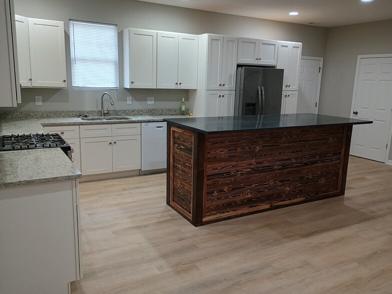 THE HOME - Cozy home completely remodeled in 2025; only 1 minute from the highway. Highlights - open floor concept with luxury vinyl flooring, granite countertops, custom charred island with hickory, 3 tiled showers and an ensuite with a double vanity in the master. Soft water. 4 Spacious bedrooms, 3 Full baths, and a bonus area perfect for gamers or a reading area. Off street parking in the front and rear of the property.