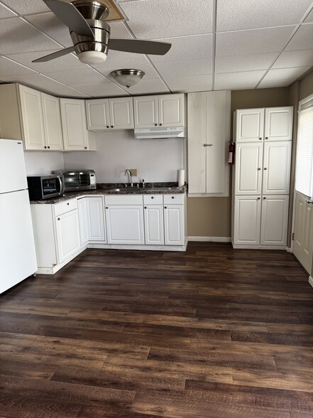 Kitchen with appliances. Microwave, countertop oven, 2 burner built in stove top.
