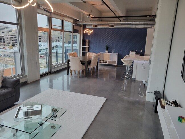 Corner unit on the Southwest corner of the unique Whiteline Lofts in downtown Des Moines. Convenient walk to restaurants, farmers' market, and all downtown has to offer. It features full furnishings, a private balcony, floor to ceiling windows all around, lofted ceiling, newly updated kitchen with granite countertops, polished concrete floors, in-unit washer/dryer, smart home features with LED lighting, and a 75" TV. Large 1053 sq ft layout with a separate private balcony. Rent includes heating, water, sewage, trash, DirectTV, internet, fitness center, rooftop terrace, dog area, and concierge. Renter pays electric only. Dog friendly building - dogs okay with deposit. No smoking allowed. 12-month lease, available June 1st.