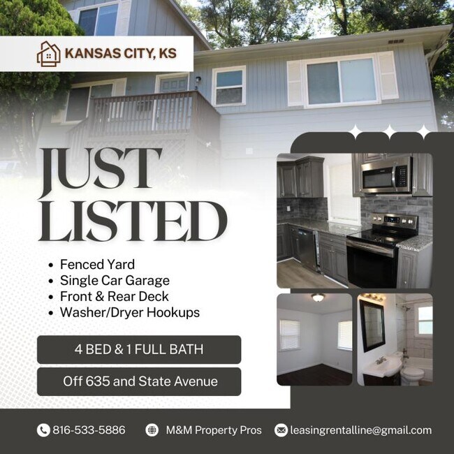 Beautiful 4 bedrooms and 1 bath home located on Freeman Ave in Kansas City, conveniently near State Ave and off to I-635. This cozy home features hardwood flooring in the living room and VPL flooring in the bedrooms for a clean and modern feel. The kitchen offers granite countertops, and comes equipped with STOVE, REFRIGERATOR, MICROWAVE, and DISHWASHER, providing plenty of cabinet space and functionality. The bathroom has been beautifully included with a tile surround and accent finishes. Additional features include a front porch deck, rear deck, and a fenced backyard perfect for outdoor enjoyment. Also includes, single car garage, washer/dryer hookups and central heating and AC. Rent $1850.00 - $1850.00 Security Deposit We will require tenants who will take care of the property and treat and care for the property as their own. ****LEASE IS REQUIRED***** Small dog MAY be considered with a $25.00 monthly pet rent and pet screening. If a dog is allowed, the dog will need to be on a leash whenever outside and yard waste cleaned up at all times. 1 small dog under 20 lbs could be allowed with $25.00 per month pet rent and $300.00 NON Refundable PET FEE. Serious Applicants ONLY! Anyone over the age of 18 living at the property must put in a application. Property is RENTED AS-IS. No other improvements will be made. The tenant is responsible pays all utilities, electric, gas, sewer water. Tenant will provide and maintain renters insurance, general care and general maintenance, i.e., smoke detectors batteries, light bulbs, co2 monitor batteries, filter changes, and maintaining the property as there will be 2 property inspections per year to make sure the tenant is in lease compliance. Tenant is responsible for lawn, snow, trash and all utilities. ***NO SMOKING of ANY KIND IS ALLOWED INSIDE THE PROPERTY*** Property is RENTED AS-IS. We are looking for a long term tenant to take great care of our beautiful home. View our website at CALL or TEXT now to schedule a showing with a leasing agent. ***** We will never ask you for a deposit or rent before you have viewed the property.*** Anyone who would be living in the property 18 and over is required to submit their application. Application Fee is $47.00 per person. All applicants are welcome to apply. The landlord does not discriminate based on source of income. Call for application. All application fees are NON Refundable. Once application is approved a non refundable reservation fee is required to take property off the market and hold it for your move in date that is to be within 30 days of your approved application. Avoid SCAMS, we do NOT advertise on Craigslist or FACEBOOK Market place. You will speak and meet with a leasing assistant!
