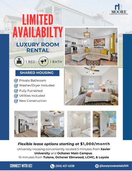 Property Id: 1816590 SHARED HOUSING in Newly Constructed Modern Duplex! This luxurious multifamily home is located 5 mins from Xavier University and Ochsner Main campus, and 10 mins from Tulane & Loyola. This bottom unit consists of 3 separate room rentals, Suites D, E, & F. This listing is for "Suite E". All Rooms/Suites come with keypad locks for security. The bedroom is fully furnished with a full size bed, desk, night stand, and modern decor. The suite also features a private bedroom/bathroom. The Palisades is a positive and cohesive housing community. The SHARED LIVING SPACE includes the kitchen, living room, and laundry area, which feature brand-new stainless-steel appliances and quartz countertop finishes. The property also has Driveway, Off-Street, and designated parking area next door with security cameras. This property is great for graduate students or traveling professionals. We currently have 2 female grad students in Suites D and F.