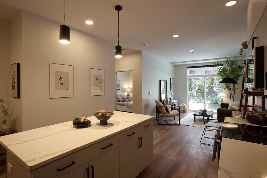 The Eddy offers 250 thoughtfully designed apartments with studio and one-bedroom floor plans, each featuring sophisticated interiors curated for a modern yet inviting lifestyle. Residences include in-unit laundry, stainless steel appliances, matte black finishes, quartz or granite counter-tops, wood-paneled flooring, and central air and heat.