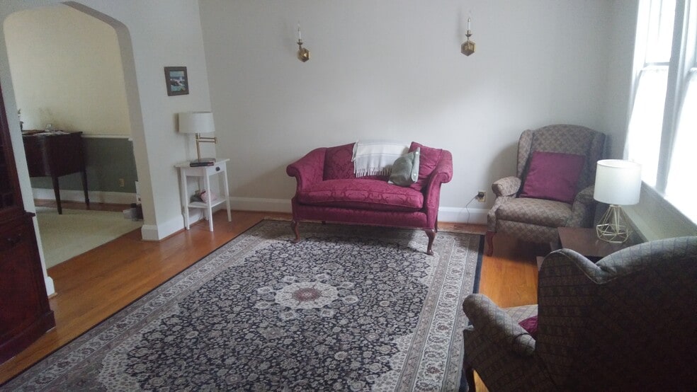Low-maintenance daylight rowhouse in a quiet, leafy neighborhood suitable for individuals or small families. First floor contains living room, galley kitchen, & dining room (seats 6). Second level has 3 bedrooms, one currently configured as an office. Walk-out basement with laundry and utility areas. 2 full bathrooms, one with a shower and one with a shower-bath combination. Each level has a smoke/carbon monoxide detector; all bedrooms have additional smoke detectors. Outdoor space includes mature trees, covered front porch & patio with dining table in small, fenced backyard. Street parking on quiet 1-way street + 1 dedicated parking space. Sociable historic district neighborhood is known for holiday light display & popular with trick-or-treaters. Owner will consider pets. Available for 6- or 12-month rental, furnished or unfurnished, from August 2026.