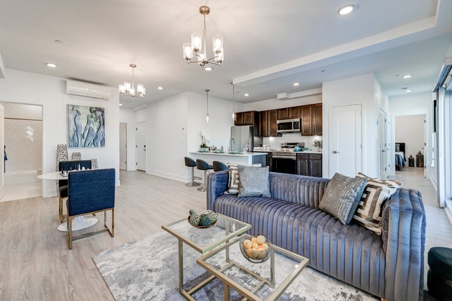 Built in 2023, these new apartments step into open floor plans with soaring ceilings, creating an airy, welcoming ambiance that's flooded with natural light. Your gourmet kitchen, adorned with sleek stainless steel appliances and black matte hardware, will inspire your inner chef. The custom walk-in closets, engineered hardwood flooring, quartz countertops, Philip Jeffries wallpaper, and posh lighting add more than a touch of opulence to your everyday routine.