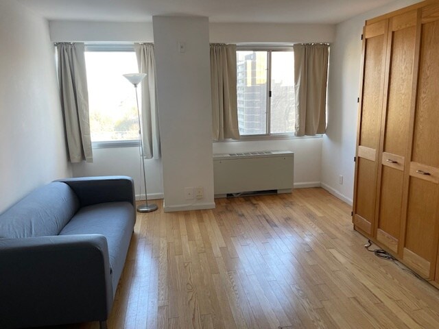Efficiency with all new paint and hardwood floors. Traditional floor-plan. Nice bathroom, Murphy bed attached to wall, walk-in closet . Very well kept with large windows and lots of light. Disposal, Microwave, Oven/Range-Gas, Refrigerator, Stove.