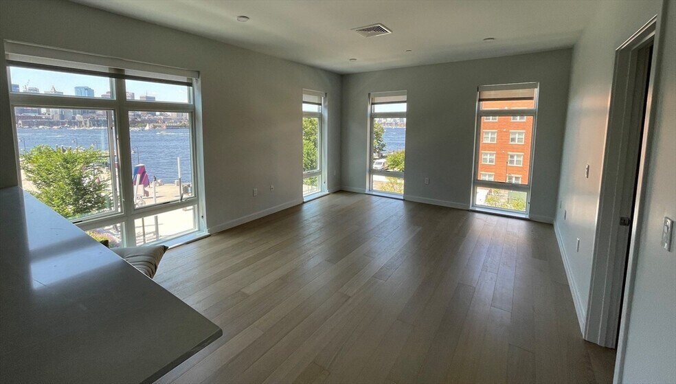 Spectacular waterfront three-bedroom + two-bathroom corner penthouse with sweeping Boston harbor view! Flooded with light through oversized windows from 3 exposures, the open concept living room + kitchen features stainless appliances and beautiful pendant lighting over Silestone countertops. The soft palette is anchored by Cobble Oak Kember floors throughout. The primary bedroom features a beautifully appointed en-suite bath. The two additional bedrooms and sleek second full bath completes this trophy home. Embrace life in East Boston enjoying waterfront dining, dynamic art installations, an abundance of recreational activities as well as convenient access to the water taxi or MBTA that delivers you to downtown or to the Seaport within 10 minutes. Harborwalk Residences, Waterfront Living Within Reach! Pets welcome.