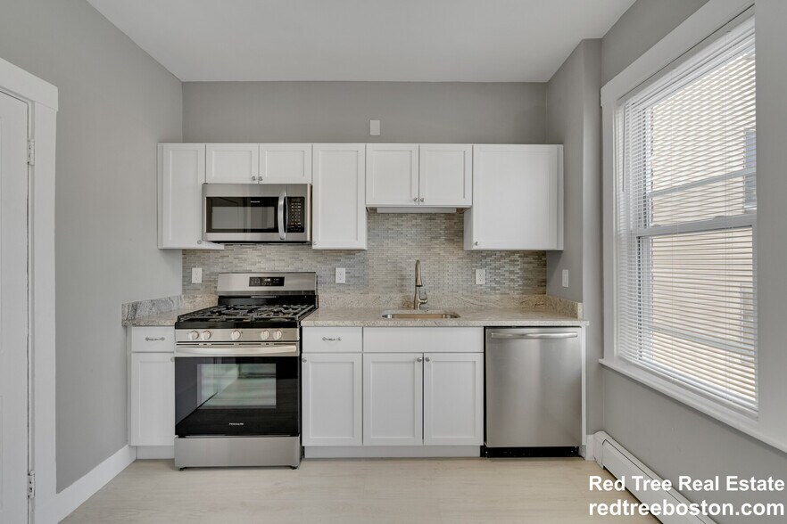 Beautiful Cleveland Circle 4 bedroom 2 bathroom, modern kitchen with new appliances, tiled bathrooms and hardwood floors throughout. Enormous bedrooms with new windows. In-unit laundry. One outdoor parking spot included. Moments to shops and restaurants, across the street from the Green Line T stop. Available Sept 1, 2026. No pets.