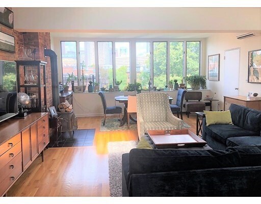 Amazing Tremont St location near Dartmouth St in the heart of the South End. Gorgeous sunny upper duplex with dramatic skyline & park views! Spectacular wide-open living room with soaring vaulted ceilings & skylights. ****This unit also overlooks & has access to gated & keyed Montgomery Park (see pics)**** 2 large bedrooms plus den/home office. 1.5 baths. Updated kitchen with stainless steel appliances, quartz counter tops & plenty of cabinetry. Laundry in unit. Central AC.