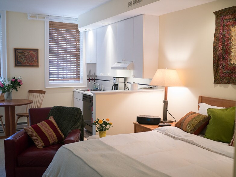 Available from Nov 1 .All utilities, cable tv and WIFI included. One dog is welcome FURNISHED STUDIO APARTMENT. TEMPORARY HOUSING. STUDIO (1 ROOM WITH KITCHEN), 1 BATH APARTMENT WITH PRIVATE ENTRANCE Elegant oasis in the heart of the city! The best of all worlds: a stylish, comfortable studio with beautiful indoor and outdoor spaces. Everything you’ll need for your home base while you explore Boston: comfortable queen bed with soft linens, full kitchen, washer/dryer in the unit, lovely bath (its advanced heat/vent system ensures that there’s no fog when you shower or bathe), built-in desk, cable with extras, and WIFI. Enjoy a cup of coffee or an al fresco meal at your table in the private manicured patio (it overlooks a hidden park—a rarity in the city!). You are steps away from public transportation, and Boston’s finest dining and shopping. All utilities, linens and kitchenware included. A treasure! In winter we rent this monthly unless it is available at short notice. Utilities, Cable TV and WIFI included. Linens and kitchen items provided.$105 monthly and $150 departure cleaning fee. $100 pet fee (except service dog)