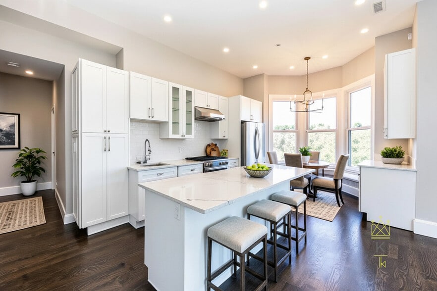 Welcome to The Residences at Regent, where timeless elegance meets modern luxury! Enjoy this expansive 2-bedroom, 2-bath residence offering 1,152 square feet of thoughtfully designed living space. The open-concept kitchen features sleek stainless steel appliances, an island bar perfect for casual dining or entertaining, and flows effortlessly into a sunken living room creating a dynamic and inviting layout. Rich hardwood floors add warmth and elegance throughout, while large windows bring in abundant natural light, both bedrooms are generously sized, and the two full bathrooms offer modern fixtures and ample storage. Step outside to your oversized private deck, ideal for morning coffee, evening gatherings, or quiet relaxation. This unit comes equipped with laundry in-unit, central AC and includes 1 parking spot and private storage along with heat and hot water in the rental price. Landlord pays the fee!! Historic Charm Meets Modern Living 9-Unit Apartment Building in Fort Hi