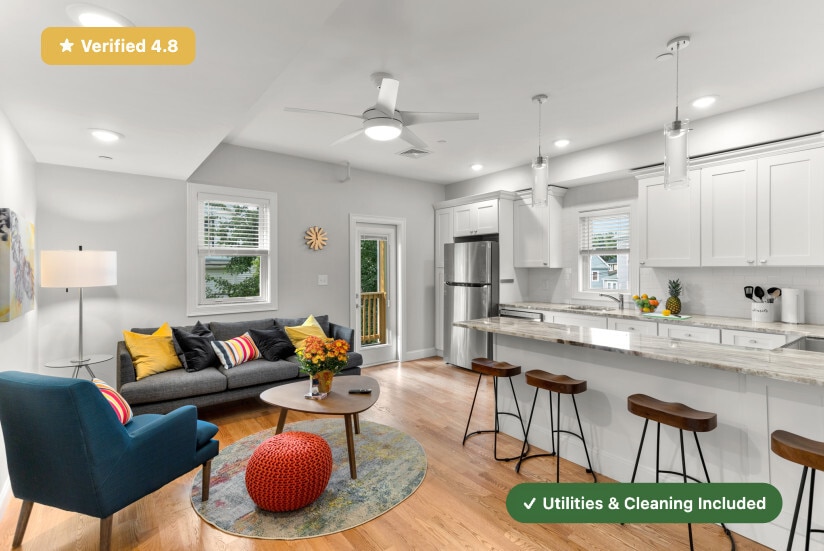 No broker fee! Only last month deposit needed. RoostUp is offering a beautifully renovated private bedroom with ensuite bath in East Boston. Less than a 5 minute walk to Orient Heights MBTA Blue Line train station in a 5 bedroom/5 bath apartment. Check out RoostUp's 100+reviews averaging 4.8-stars on Google and Facebook. Completely furnished all-inclusive concept from RoostUp. Fully-equipped kitchen included with granite countertops, new appliances and 4K Smart TV. RoostUp amenities include all utilities, high-speed WiFi, in-unit laundry, central air, and bi-weekly cleaning. Here's what is included: Furnished private bedroom with private ensuite bath ------------------------------------------------------ - New bed and high quality mattress - Matching dresser with desk, lamp and chair - Full length mirror and coat rack - Custom closet system with built in storage Stocked kitchen and furnished living area ----------------------------------------- - Renovated kitchen with new countertops & stainless steel appliances - Kitchenware, dishes, glassware and flatware - Fully furnished including sofa, chairs, coffee table - 4K Smart TV Utilities & Cleaning ------------------- - All utilities (gas, electric, wifi) - Bi-weekly professional cleaning - 1Gbps WiFi - Keyless smartphone locks - Central A/C - Free in-unit laundry - Weekly trash and recycling removal - Included for one flat monthly fee RoostUp never charges a broker fee or security deposit. Only First and Last Month Rent due at lease signing. Sorry, no pets. The RoostUp application process includes a credit and background screening. International applicants can submit copies of valid passport & visa. Please note there is an application process that includes a credit and background check.