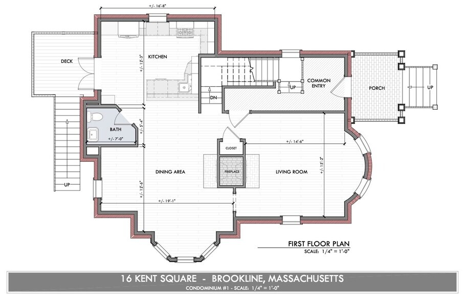 FIRST FLOOR: Ten foot ceilings, open concept floor plan, living room with bay windows, two gas fireplaces, and hardwood floors throughout. Oversize dining area, office nook, half-bath, and gourmet kitchen. French doors to private deck overlooking Northeastern University playing field.