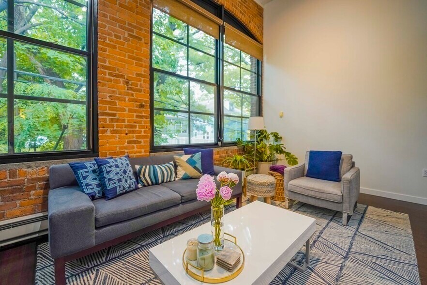 Available as of 9/15! Stunning 1-bed, 2-bath + office loft with soaring 15’ ceilings, gorgeous light, private patio, 2 assigned parking spaces, and in-unit laundry. This modern space is a rarely available 1 ½ ‘bay’ sized unit. Large office/den & full bath downstairs. Primary bed & bath are lofted for privacy with extensive California Closet built-ins for storage throughout. Kitchen features high-end appliances & a new fridge. Custom blackout blinds for restful sleep. Owner is updating with fresh paint, a new kitchen backsplash, water filtration & lighting. New photos coming soon! Well maintained common areas include lawn & herb garden. Close to groceries, restaurants, medical, library, golf, parks & new bike path accessible behind the building. Secure bike storage. Public transit with easy access to Harvard Sq and Boston. Nestled off Aberdeen Ave, next to Fresh Pond. Dogs ok. No smoking. Credit report, application & references are required. Minimum 12-mo lease, 24-mo preferred.