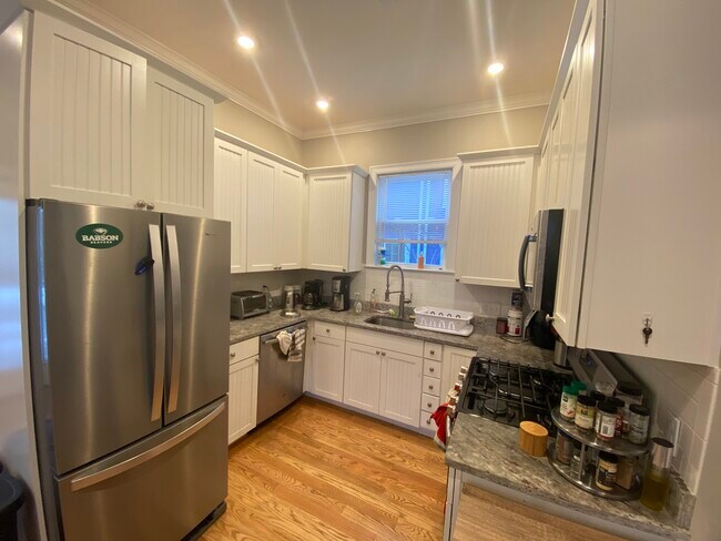 · 5 bed/2 bath (third floor) · Building renovated in 2018 · Gorgeous white-granite counters and cabinets · Stainless steel appliances · In-unit laundry · Modern/tiled bathrooms · Hardwood floors throughout · Central heat/ac (NEST thermostat) · Private back and front deck · Off-street parking available for rent