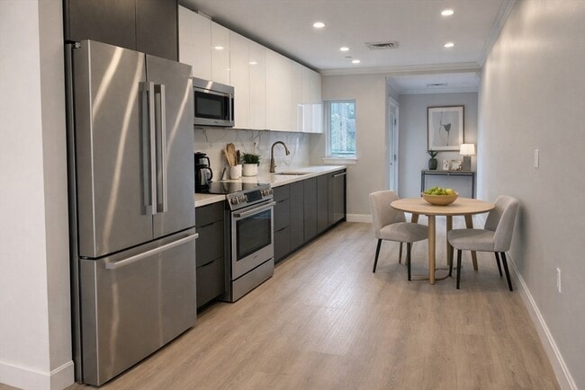 Bright and modern 3rd-floor end-unit condo in a 20-unit building with elevator access. This 1,050 sq ft home features: 2 bedrooms / 2 bathrooms – primary suite with en-suite,walk-in closet,air tub,and designer finishes. Open living & dining area – large northwest-facing windows,Kichler wall sconces,Morris & Co. Chrysanthemum wallpaper,crown molding,and ceiling medallion. Kitchen highlights – Bosch appliances,Calacatta quartz counters,LED under-cabinet lighting,French door fridge with water/ice dispenser,touchless Delta faucet,and white fireclay sink with disposal. In-unit convenience – stacked Bosch washer & dryer,Ecobee smart thermostat,heat pump HVAC,fire sprinklers throughout. Private outdoor space – sunny 200+ sq ft balcony with storage shed and wall spigot,perfect for relaxing or gardening.Building amenities – rooftop deck with gazebo and seating,lobby mailroom,elevator. Parking included – rare two deeded spots (1 garage,1 covered outdoor). MLS# 73477658
