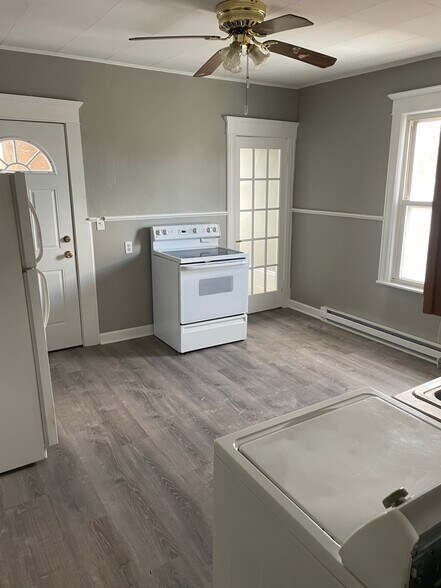 Bright 3rd-floor R apartment. 1 bedroom, 1 bath with eat-in kitchen. Includes stove, refrigerator, washer and dryer.