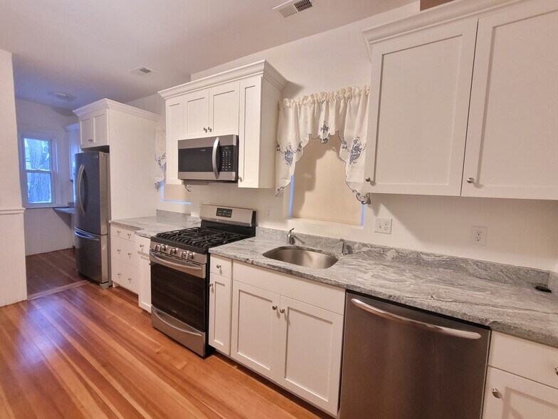 - Modern eat-in kitchen with granite countertops, stainless steel appliances, dishwasher