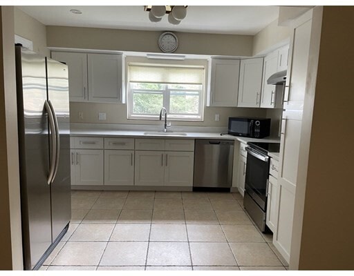 Lovely WELL maintained 2nd and 3rd floor in 2 family just renovated. New kitchen, remolded baths on main level- just redone hardwood floors ! New kitchen flows into dining area that flows into LARGE LR with ornamental fireplace. Main BR has double closet and 3/4 bathroom. Other 2 BRs share 2nd full bathroom- linen closet and coat closets are provided. On this second floor main level there is an enclosed unheated porch. A back hallway has stairs up to 3rd floor where there is another BR, full bathroom, a nd large room for sitting or working. Basement area finds washer/dryer, small area for storage, and a garage parking space- there is another 1 or 2 parking space in the driveway. There is a yard area for enjoyment and this property is minutes away from the green D T" line to Brookline and Boston. Newton Centre commercial area has many stores- restaurants-coffee shops- bakeries."
