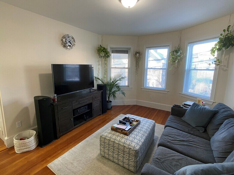 Very bright & open living room. Available April 1st. - Central AC - New heating and hot water system (gas) - New windows - HW floors throughout - New kitchen, maple cabinets - Rear yard (shared) - Plenty of basement storage - One parking space and plenty of on street parking, not a problem in this area - Utilities not included, gas heat & hot water. Efficient, new systems. - Fully insulated - Each room wired for cable TV & phone/internet - High ceilings