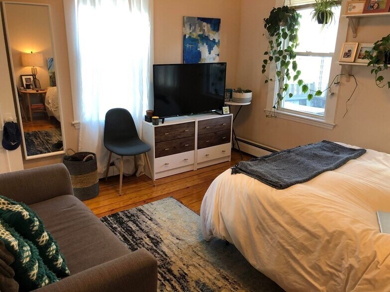 Available January! Convenient West Somerville, Teele Sq location walk to Davis Sq. and close to public transportation along Broadway. This is a sunny two room studio apartment on the top floor of a quiet building. Hardwood floors throughout. Front covered porch and a shared roof deck. Coin operated laundry facilities in basement. Rent includes heat and hot water!