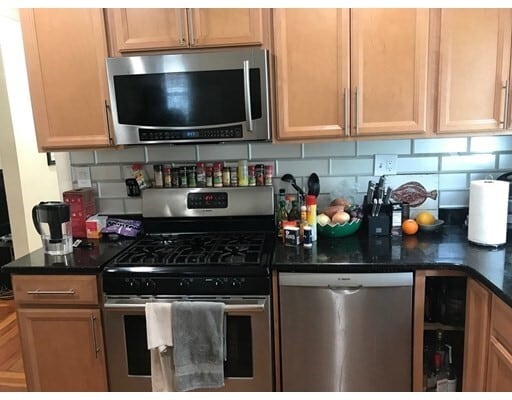 Renovated unit with 3 good sized bedrooms and 2 baths. Beautiful newer marble bath and one en-suite bath. Central AC/heating. Kitchen with Bosch stainless steel appliances, granite counters, custom maple cabinets. Cable in bedrooms, good closet storage. Laundry and extra storage in basement. Delivered professionally cleaned. Building has blown in insulation reducing utility costs. Private rear deck faces back yard with patio. Quiet neighborhood. Walk to New T line, Teele Sq., Davis Sq. and Tufts. Easy access to buses, shuttles, I-93 and RT-2. No pets and no smoking. 1 tandem parking spot in driveway is included. Available 9/1/23.