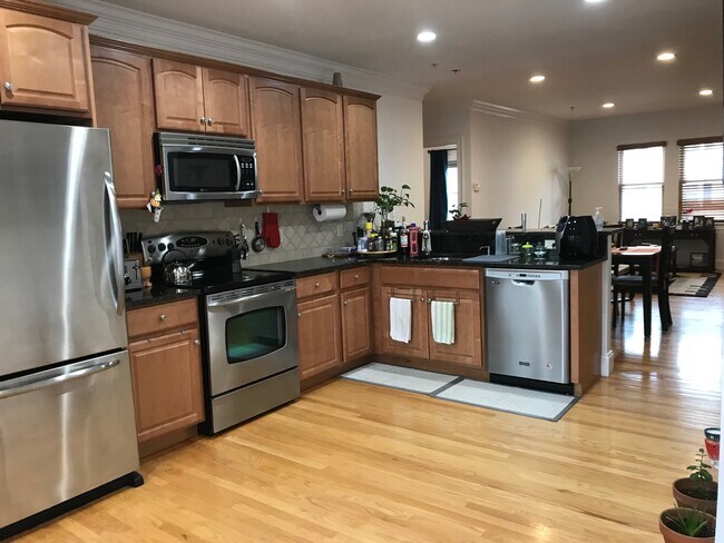Two bed/two bath apartment with modern open kitchen. All rooms are in pristine conditions and filled with natural light. Master suite with bathroom. Ideally located close to bus & train stops and short access to I-95. Shops, restaurants and many other amenities within walking distance. 2 parking spaces with direct access to the rear entrance of the unit. On-street parking available. 20 mins from Boston. W/D in unit. Dishwasher. No broker fee! Unit is not furnished, water included.