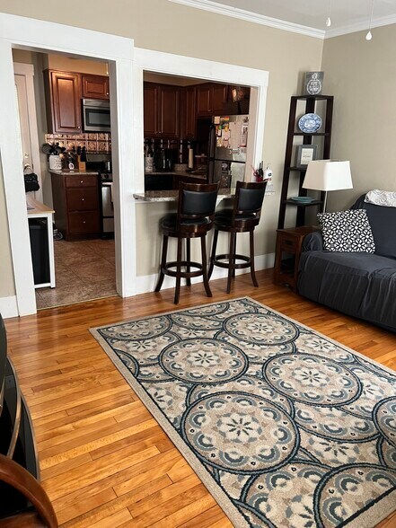This 2 bed 1 bath large duplex with private driveway. First floor includes large living room with decorative fireplace and high ceilings, dining room with built in china cabinet, kitchen with granite counters, stainless steel appliances, and fixtures. Entire first floor will have hardwood flooring. Second floor has two large bedrooms with double closets in both including one walk in closet. Second floor will also be all hardwood flooring. washer/dryer in basement, large yard and a brick patio area for grilling. This unit is pet friendly (some breed restrictions). Snow removal tenants responsibility. Landscaping done by owner. 2 car private driveway parking. Gas heat , ac on first floor