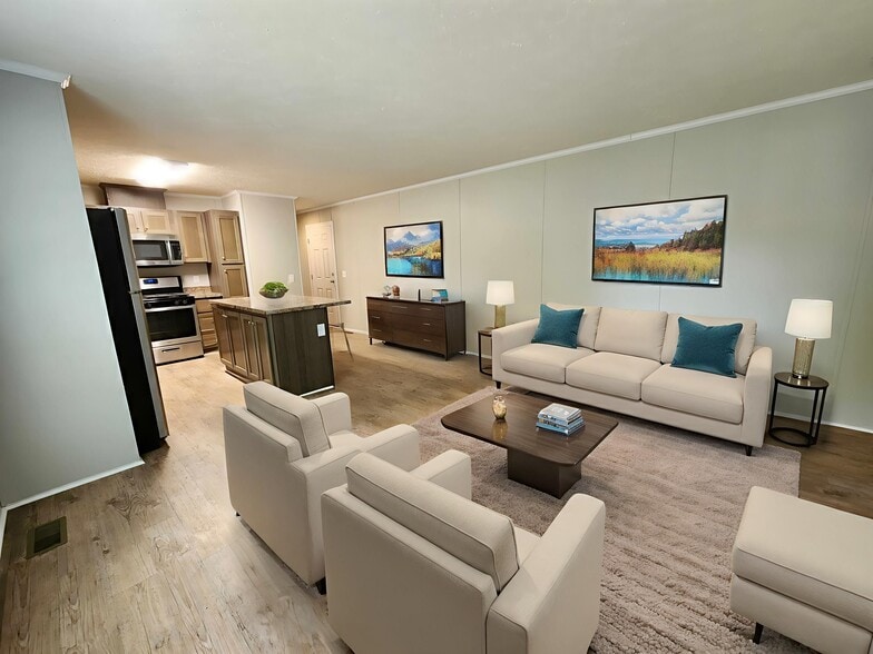 Discover this stunning 3 bedroom 2 bath home where modern elegance meets everyday convenience. The open concept living room and kitchen create a warm welcoming space highlighted by a beautiful island and abundant cabinet storage perfect for casual meals or gourmet cooking. Stay comfortable year round with central air and enjoy added convenience with in home washer and dryer hookups. Outside a handy shed offers extra storage for outdoor gear. Schedule your tour today and see the possibilities. Some photos have been virtually staged.