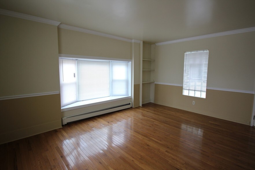 ** LARGE, BRIGHT BEAUTIFUL LIVING ROOM: Big windows, including bay window with window seat, hardwood floors and built-in bookshelf, designer custom two-toned paint with trim and chair rail